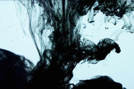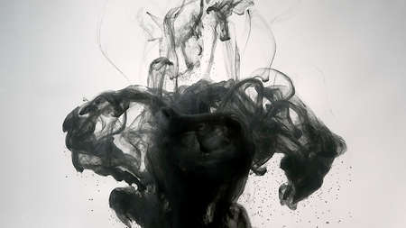 Black cloud of ink on a white background. Black watercolor ink in water on a white background. Colored acrylic paints are mixed in water. Awesome abstract background.