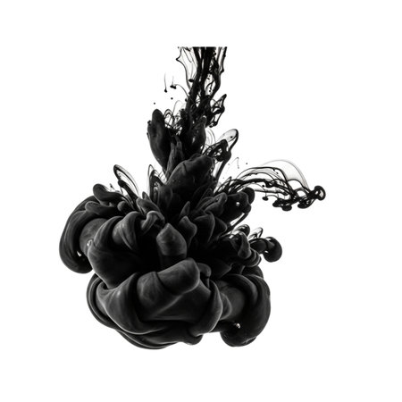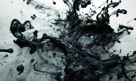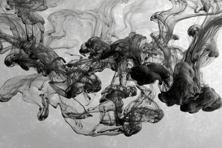 Black ink spreads and merges within a liquid, creating dynamic, abstract shapes. The composition features flowing lines and textures against a light background. This visual could be utilized in design projects or commercial artwork seeking an artistic, eye-catching element. It is suitable for various creative applications.