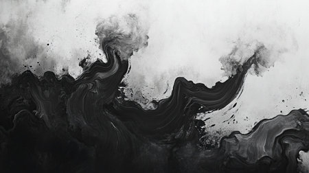 This artistic features composition flowing lines and ink splash details in monochrome black and white. The high contrast creates a sleek and modern visual effect, embodying minimalist abstraction.