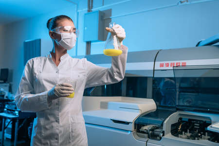 Woman Laboratory assistant conducts experiments in the laboratory