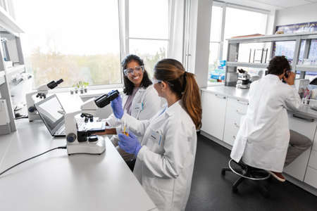 Women work in the lab. Conducts experiments on vaccines.