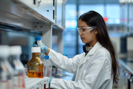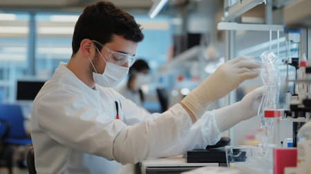 Young scientist conducts research in a laboratory while wearing protective gear and gloves to ensure safety and accuracy