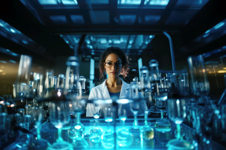 Focused female scientist examining test tubes in dimly lit high-tech laboratory environment. Generative AI