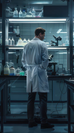 Medical bio laboratory, Research, Science test technology. Pharmaceutical lab specialist examines medicine vials, hospital patient samples. Medical student conducts research. Realistic style photo