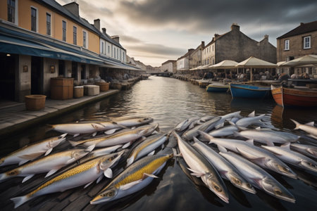 A beautiful array of freshly caught fish arranged in woven baskets at a bustling market by the water. The vibrant seafood scene captures local culture and tradition.