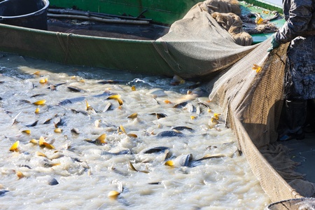 Fishing pond - sorting fish carp and other fish