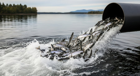 Salmon release from pipe into lake with forest and mountain background