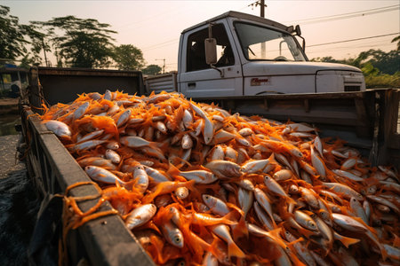 Glistening silver fish float in a fishing basket on crystal clear turquoise water, with a colorful fishing boat and nets in the background, highlighting sustainable fishing