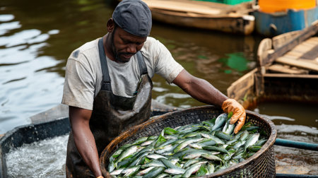 A farmer harvesting tilapia from an aquaculture pond, ready for the fish market