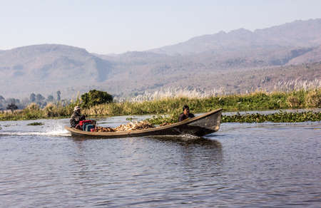 INLE LAKE, MYANMAR - AUG 16, 2015 : man in a boat with vegetables. People of the region built on the water houses on piles and live on culture of fruits, vegetables and flowers on incredible floating islands