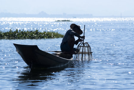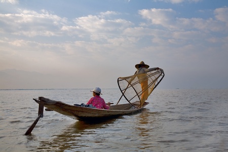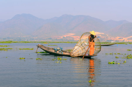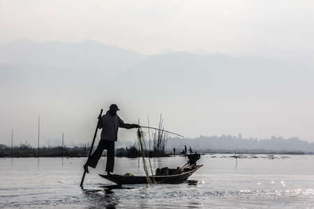 INLE LAKE, MYANMAR - FEBRUARY 17: Fisherman catches fish for food on February 17, 2011 on Inle Lake, Myanmar. Intha people possess the feet-rowing style and the unique fishing equipment