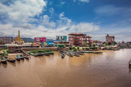 Canton de Nyaungshwe, Myanmar. July 31, 2019: Inle Boat Station in Inle Nyaung Shwe Canal. A series of fishing boats along the river generated by Inle Lake. Homes and Pagoda temple in the background.