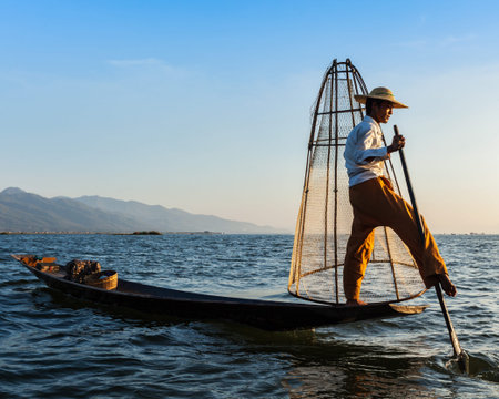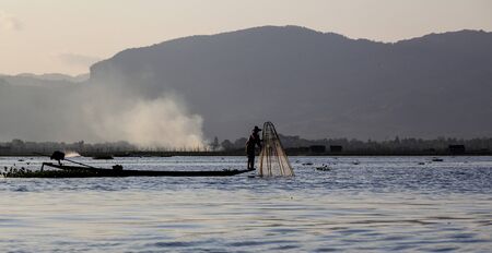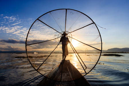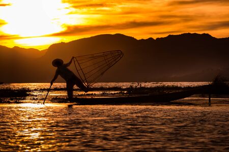 Leg fishing on the Inle Lake at the sunset Myanmar or Burma. Burmese fisherman on boat is catching fishes by traditional net