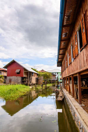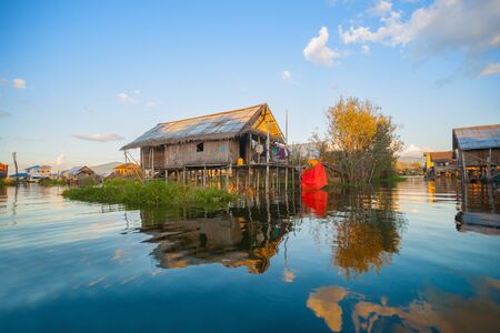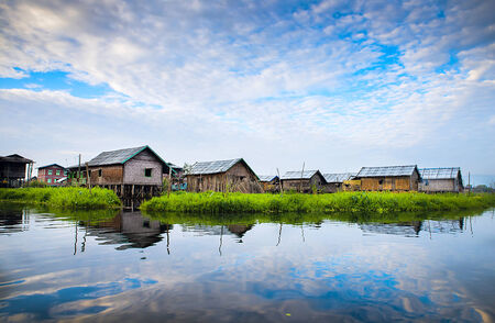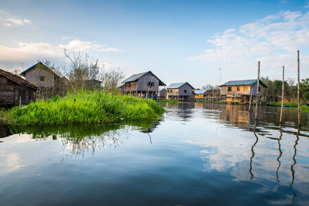 Ancient houses and their reflection in the water on the Inle Lake, Myanmar