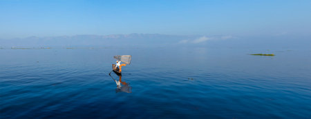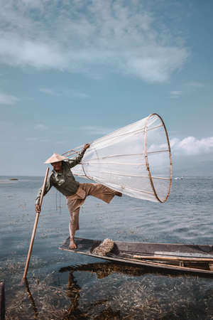 Nyaungshwe Township, Myanmar (Burma). January 11, 2019: Intha fisherman one leg stand pose with conical net , Inle Lake in the Nyaungshwe Township