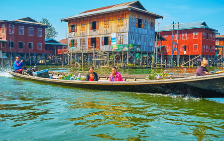 INPAWKHON, MYANMAR - FEBRUARY 18, 2018: Canoe boat with local villagers floats along the water street with stilt wooden houses, on February 18 in Inpawkhon.