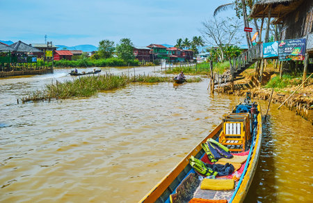 Nampan, Myanmar - April 2019: Traditional Burmese wooden boat going through Nampan floating village at Inle lake