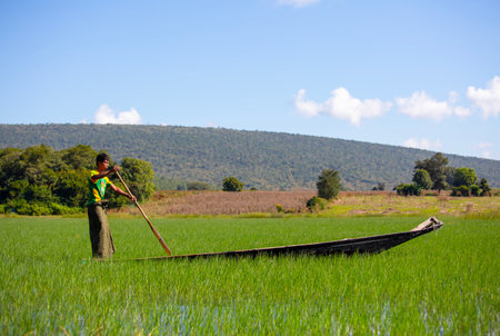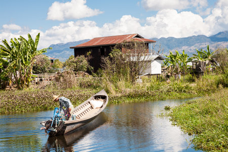 Kaung Dain Inle Lake, Burma - 2017, January 6 : A man standing in his small boat floating on a canal in the village of Kaung Dain on the Inle Lake in central Myanmar