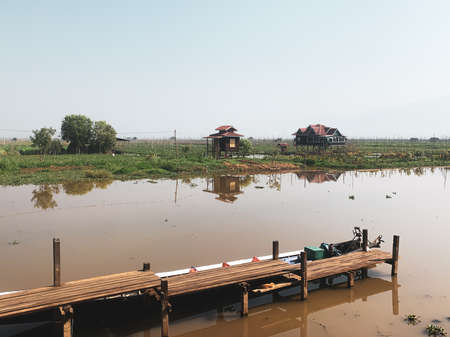 Rural area of Inle Lake Myanmar brownish water with farm land on water marsh country side boat dock.