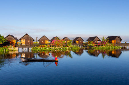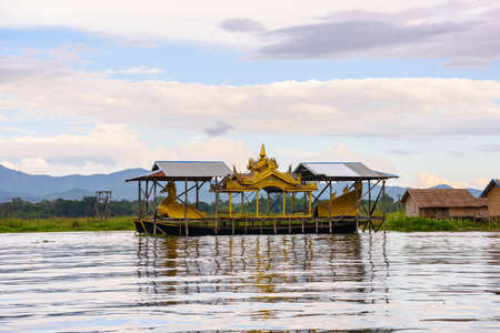 Maing Thauk, Myanmar - April 2019: traditional Burmese floating house reflecting in water of Inle lake. Boats on the foreground.