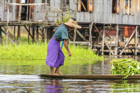 NYAUNGSHWE, MYANMAR - DECEMBER 18, 2016 : Burmese woman harvest aquatic plant from the lake for making floating garden in Inle lake, Myanmar.