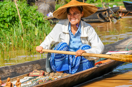 Inle Lake, Myanmar - January 04, 2007: Burmese native people sell vegetables, fruits, and craft on traditional floating morning market at stilt houses village near Nyaungshwe Township on Inle lake.