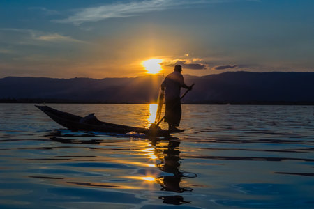 Fisherman with Leg rowing during Sunset, inle lake in Myanmar Burmar