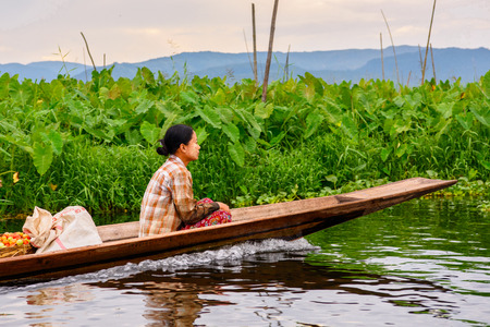 INLE LAKE, MYANMAR - AUG 30, 2016: Unidentified Burmese girl in bamboo boat sails over the Inle Sap,a freshwater lake located in the Nyaungshwe Township of Taunggyi District of Shan State, Myanmar