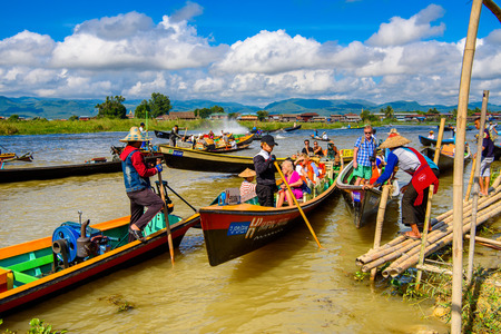 INLE LAKE, MYANMAR - MAY 25, 2014 : Village, boat and local people lifestyle at Inle Lake Pier