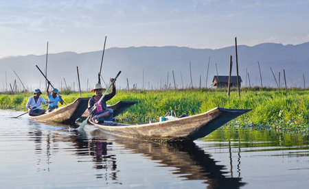 Intha fishermen working in the morning. Location of Inle lake, Myanmar.
