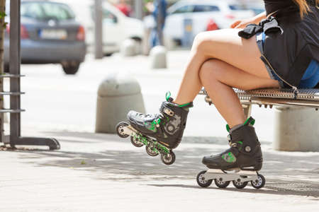 Woman is going rollerblading. Sitting on a bench in a park and putting on inline skates. Close up. Sport lifestyle.