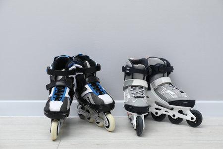 Pairs of roller skates on floor near white wall