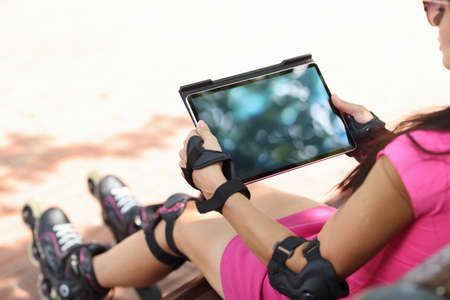 Young woman sits on park bench with tablet and roller skates closeup
