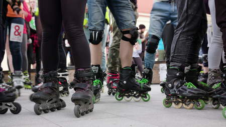 Lublin, Polland - May 2017: Many legs in roller-blades. Low angle shot