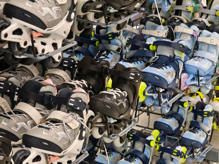 Pairs of roller skates in shelving unit, closeup