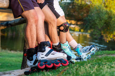 Closeup of people friends with roller skates. Woman and man relaxing outdoor.