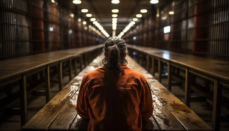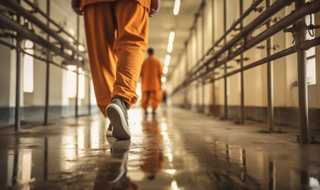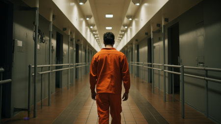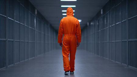 An evocative image of a solitary figure dressed in an orange jumpsuit, walking away in a dimly lit prison corridor, highlighting themes of confinement and isolation.