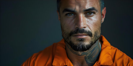 Man in an orange jumpsuit stars directly into the camera from prison. Concept Prison Photography, Inmate Portraits, Incarceration Art