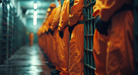 A solitary individual in an orange jumpsuit walks down a dimly lit corridor, creating a powerful sense of isolation and mystery in an industrial setting.