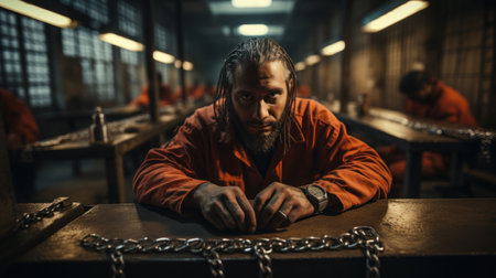 Prisoner with chains in his hands sitting in cell.