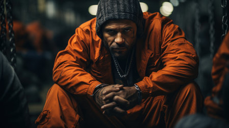Intense close-up of a handcuffed convict wearing an orange prison uniform and a beanie, creating a powerful and dramatic atmosphere.