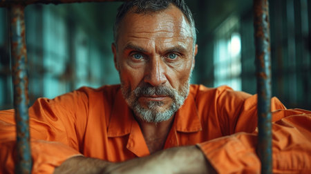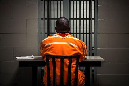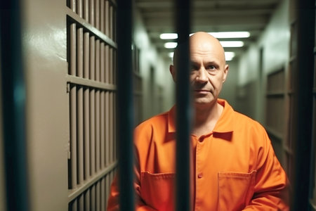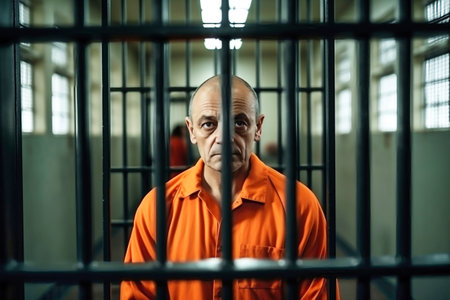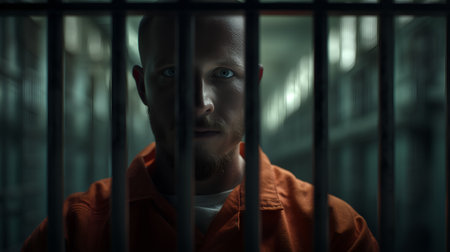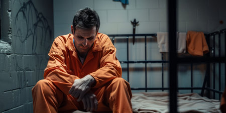 A prisoner in an orange uniform sits in front of a door with metal bars. AI-generated.