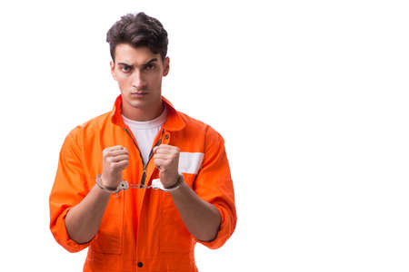 Prisoner in orange jumpsuit on gray background