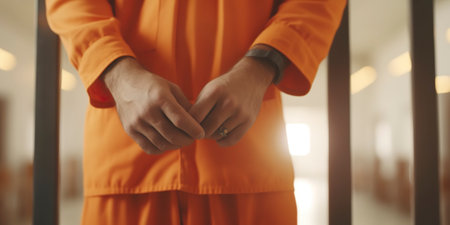 Detail of the hands of a prisoner handcuffed, with an orange suit.