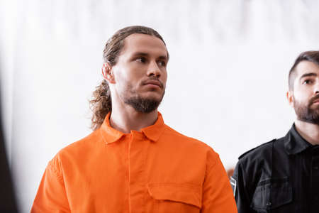 accused man in orange uniform looking away near bailiff in court