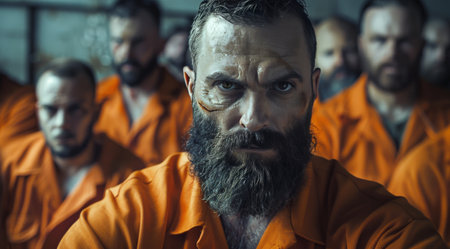 A bearded prisoner in an orange jumpsuit stars intensely into the camera. He is surrounded by other prisoners in similar atmosphere, all in a dark, prison-like setting.