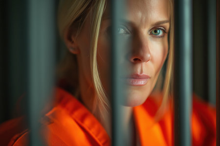 A young woman with bright eyes gazes intensely from behind metal bars, wearing an orange jumpsuit, conveying a sense of longing and resilience.