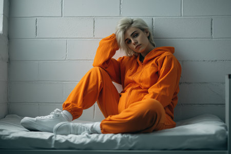 A young, stylish female intimate with short blonde hair and white sneakers sits on her cot in a prison cell with white brick walls, looking at the camera.