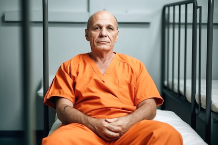 An elderly criminal in an orange uniform sits on a prison bed and thinks about freedom. A guilty prisoner in a pre-trial detention center or correctional facility