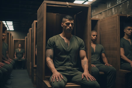Inmates behind cell bars during lockdown. Sad men suffering and looking at camera. Generative AI